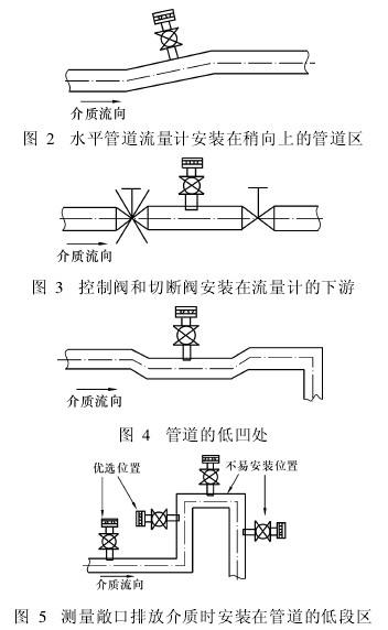 為了保障測量精度,傳感器應(yīng)避免在容易產(chǎn)生真空、氣體、渦流等地方安裝,傳感器與智能變送器之間的通訊電纜要避開電動機等強電設(shè)備。建議安裝在圖2~圖5所示位置。