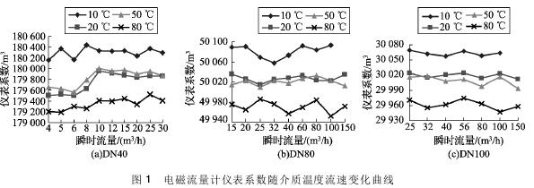 (1) 隨著介質溫度的升高,煤礦排水流量計的儀表系數(shù)均呈逐漸降低的趨勢。其中20℃和50℃的儀表系數(shù)基本相同,10℃和80℃的儀表系數(shù)與20℃時偏離較大。