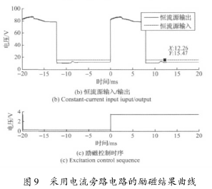 實(shí)驗(yàn)結(jié)果表明,高壓源向低壓源切換后,三端穩(wěn)壓器的工作特性致使的電流波動(dòng)和低壓源供電情況下的恒流控制,會(huì)大幅延長(zhǎng)勵(lì)磁電流的穩(wěn)態(tài)響應(yīng)時(shí)間。圖8所示勵(lì)磁電流約在17ms左右進(jìn)入穩(wěn)態(tài),圖9所示勵(lì)磁電流的穩(wěn)態(tài)響應(yīng)時(shí)間約為12ms。這表明,在采用三端穩(wěn)壓器搭建恒流控制電路的情況下,電流旁路電路能有效克服三端穩(wěn)壓器工作特性的影響,并能方便的實(shí)現(xiàn)電流超調(diào),加快勵(lì)磁電流的響應(yīng)速度。