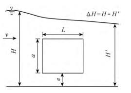 有限水域的浮體結(jié)構(gòu)在不同來流動水中運(yùn)行時(shí),浮體結(jié)構(gòu)位置的改變會對流場產(chǎn)生影響,從而影響浮體結(jié)構(gòu)的泄流能力以及穩(wěn)定性。試驗(yàn)過程中固定浮體結(jié)構(gòu)的體型不變(長L=0.20m,寬B=0.30m,高a=0.10m),分別選取4種不同來流流量Q及浮體結(jié)構(gòu)位置e,控制浮體結(jié)構(gòu)在上、下游水位不變的條件下進(jìn)行試驗(yàn),具體試驗(yàn)參數(shù)設(shè)計(jì)及說明見表1以及圖2。