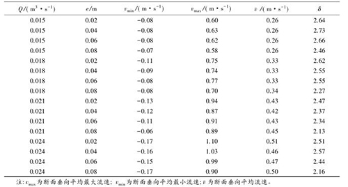 流速沿?cái)嗝娣植嫉木鶆蛱匦钥梢酝ㄟ^流速分布不均勻系數(shù)進(jìn)行表征,通過所選取斷面*大流速和*小流速的差值與該斷面平均流速的比值,δ值越大表明浮體結(jié)構(gòu)的存在對水流斷面流速的分布產(chǎn)生的影響較大。表2中,當(dāng)來流流量相同時(shí),流速的不均勻系數(shù)多數(shù)隨e的增大而減小。浮體結(jié)構(gòu)位置較小時(shí),主流為浮體結(jié)構(gòu)上部的水流。隨著浮體結(jié)構(gòu)位置的上升,來自上游的水體逐漸分成浮體結(jié)構(gòu)上部和下部的兩股主流,流速分布的不均性減小。浮體結(jié)構(gòu)位置及所處水位條件相同時(shí),來流流量的增大,區(qū)域的平均流速增大,因此流速不均勻性減小。