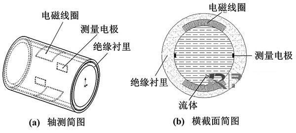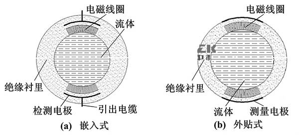 電容式150度高溫電磁流量計(jì)從根本上解決了電*表面附著、腐蝕、摩擦等問題,其電*與被測流體間有絕緣襯里隔離,或者直接采用絕緣測量管。電*置于測量管外面或鑲嵌于測量管內(nèi)部。嵌人式150度高溫電磁流量計(jì)和外貼式150度高溫電磁流量計(jì)的結(jié)構(gòu)如圖2所示。