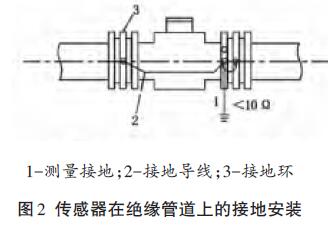 傳感器安裝在塑料管道或內(nèi)壁有絕緣涂層、襯里的管道上,兩端應(yīng)安裝接地環(huán)(或帶有接地電*的金屬短管),然后用導(dǎo)線連接,使管內(nèi)流動(dòng)的介質(zhì)與大地短路,具有零電位(見圖2)。