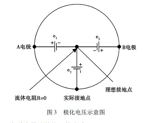 在被測液體與電*和接液部件接觸過程中,電解質(zhì)中的正負離子會分別作定向運動,這會使被測液體在電*和接液部件之間形成電位差,通常將這種現(xiàn)象稱為*化現(xiàn)象。如圖3 所示,理論上來說,兩電*A 和B 對接液部件的電位e1、e2大小相等、方向相反,此時兩電*的電位差等于零。但是,若兩電*的材質(zhì)或表面狀態(tài)存在差異,此時A、B 電*之間的電位差就不為零,這就形成了*化電壓,*化電壓與共模狀態(tài)的電壓e3一起疊加在流量信號中,被輸入轉(zhuǎn)換器的差動放大器。當*化電壓過大,則會對差動放大器的輸入端造成較大影響,導致信號無法放大或流量信號的輸出波動過大,從而降低了粘土漿流量計的測量精度。