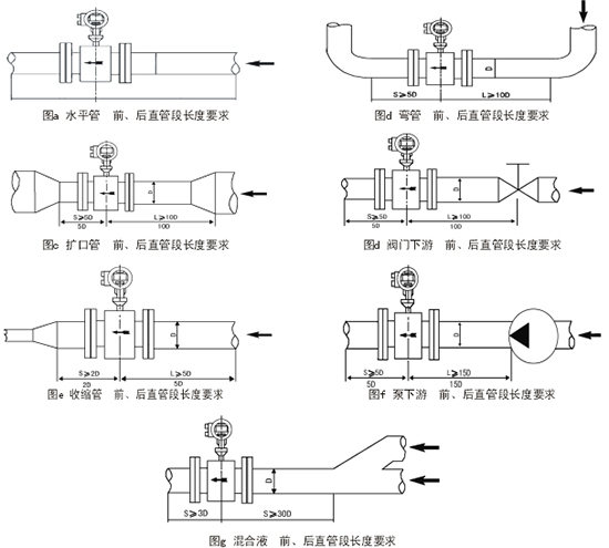 比較理想的安裝地點(diǎn)應(yīng)選擇測(cè)量點(diǎn)前后有足夠的直管段。進(jìn)口直管段應(yīng)≥5D,出口直管段≥3D(D為傳感器公稱(chēng)口徑)。