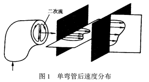 流體流過(guò)彎管由于離心力作用,靠外壁產(chǎn)生擴(kuò)散效應(yīng),內(nèi)壁產(chǎn)生收縮效應(yīng),由此產(chǎn)生橫向流動(dòng)的二次流,引起下游產(chǎn)生速度分布畸變,如圖1所示。圖1中,右邊垂直剖面彎管外緣流速較快,水平剖面呈雙峰值流速分布。隨著液流離開彎管距離增加.畸變會(huì)趨于緩和。