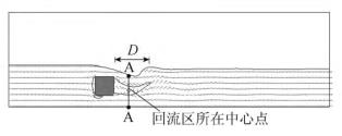 來自上游的水體經(jīng)浮體結(jié)構(gòu)的阻擋作用,水流繞流經(jīng)浮體結(jié)構(gòu)的上部和下部區(qū)域通過,并在浮體結(jié)構(gòu)背水面的下游區(qū)域形成小范圍回流區(qū),此處水流紊亂,流速分布不均勻。試驗(yàn)過程中,對回流區(qū)沿水流方向的長度D(水槽縱向中心斷面處,自浮體結(jié)構(gòu)背水面到沿水流方向流速為0的*遠(yuǎn)位置點(diǎn))進(jìn)行量測。選取浮體結(jié)構(gòu)下游區(qū)域回流區(qū)中心點(diǎn)所在斷面進(jìn)行流速測量對比。流速測量斷面位置A-A見圖3。