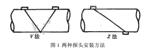 目前的流量計(jì)的基本測(cè)量原理和方法有以下三種:①時(shí)間差法,②相位差法,③頻率差法?,F(xiàn)在國內(nèi)外的大多數(shù)非接觸式超聲流量計(jì)使用的都是頻差法。例如富士株士會(huì)社生產(chǎn)的FLB-1型超聲流量計(jì)使用的就是這種方法。它提供了可供選擇的兩種探頭安裝方法。如圖1所示。其中V法適用于小管徑的管道,而Z法則適用于2000mm或更大管徑的管道。另外,當(dāng)無法提供合適的安裝間距時(shí),宜于采用Z法,因?yàn)閆法僅需V法間距的一半,同時(shí),在流體速度很高時(shí),也應(yīng)選擇Z法。當(dāng)管內(nèi)壁的污垢很厚時(shí),也不適用反射式的V法而選用Z法。但不論采用哪種方法,都很難排除隨機(jī)的噪聲干擾,造成較大的誤差。因此,我們?cè)O(shè)計(jì)了一種新型的相關(guān)式超聲流量計(jì)。