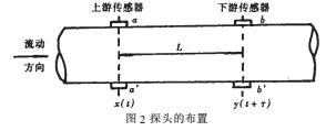 相關(guān)檢測(cè)技術(shù)在國內(nèi)外文獻(xiàn)中研究得很多,但在自來水流量測(cè)量中付諸實(shí)現(xiàn)仍是難的課題,本文所采用的相關(guān)檢測(cè)方法如圖2所示。在管道上裝有兩組傳感器,上游傳感器和下游傳感器,兩組傳感器之間距離L。相關(guān)檢測(cè)的實(shí)質(zhì)是測(cè)出流體通過線性系統(tǒng)時(shí),走過L長的距離所需的時(shí)間T。