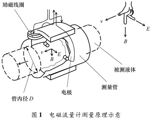一體式污水流量表的測量原理如圖 1 所示。根據(jù)法拉*電磁感應(yīng)定律,導(dǎo)電液體在磁場中流動(dòng)會產(chǎn)生電動(dòng)勢 E,它與磁感應(yīng)強(qiáng)度 B、導(dǎo)電液體平均流速 v 成一定比例關(guān)系: