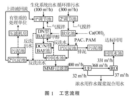 2種廢水在中間水池混勻后,通過泵提升進(jìn)入保安過濾器,進(jìn)一步去除細(xì)小的懸浮物后經(jīng)過增壓泵進(jìn)入超濾膜(UF)處理系統(tǒng)和反滲透(RO)系統(tǒng),然后通過水廠流量計進(jìn)行計量。反滲透出水直接進(jìn)入回用水池達(dá)標(biāo)回用,超濾濃水以及反滲透濃水用作水煤漿混合用水。污泥池中的污泥通過泵打入帶式機(jī)壓濾處理,濾液自流進(jìn)入1#調(diào)節(jié)池。工藝流程見圖1。
