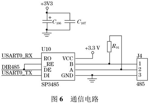 電鍍廢水流量表輸出的流量值可以通過外接的 TFTLCD 屏直接顯示,還可以通過預(yù)留的 RS485 通信接口將數(shù)據(jù)發(fā)送到上位機中。RS485 電路*大的優(yōu)點是 485 電平與 TTL 電平兼容,方便與 TTL 電路相連;抗共模干擾能力強;數(shù)據(jù)傳輸速度快,高達 10 Mbps;通信距離遠,*大為 1.2 km。系統(tǒng)采用 SP3485 芯片進行數(shù)據(jù)通信,SP3485 是一款低功耗芯片且符合RS485 協(xié)議的收發(fā)器,電路圖如圖 6 所示。