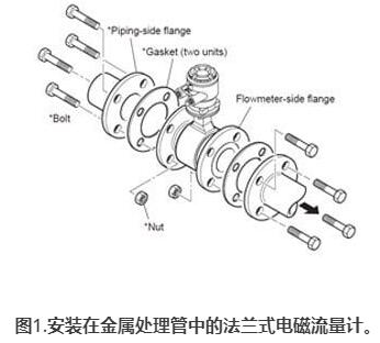 法蘭式流量管:將SG連接從工藝本身傳遞到電磁流量管的主體/外殼的*常見方法是通過法蘭的,無襯里的金屬工藝管螺栓連接到法蘭的電磁流量管(圖1)。