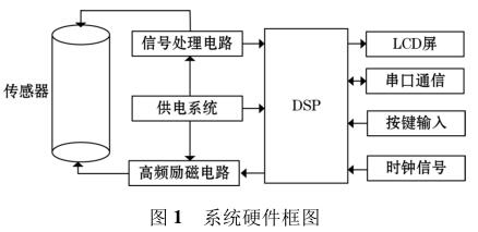 高頻勵(lì)磁智能分體式電磁流量計(jì)由傳感器、高頻勵(lì)磁電路、信號(hào)處理電路等組成,其中高頻勵(lì)磁電路決定著傳感器磁場(chǎng)的強(qiáng)弱,勵(lì)磁電路的穩(wěn)定性以及精確性決定著系統(tǒng)檢測(cè)的準(zhǔn)確性以及穩(wěn)定性。DSP 系統(tǒng)控制勵(lì)磁電路激勵(lì)傳感器線圈,當(dāng)線圈中有導(dǎo)電液體流過時(shí),其切割磁感線并在傳感器兩端的線圈上產(chǎn)生感應(yīng)電動(dòng)勢(shì),利用信號(hào)檢測(cè)電路監(jiān)測(cè)感應(yīng)電動(dòng)勢(shì)的大小,*后根據(jù)相應(yīng)關(guān)系計(jì)算出液體的流量,系統(tǒng)硬件框圖如圖 1 所示。