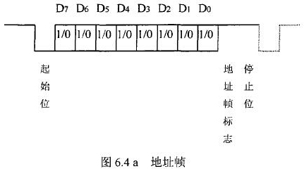 紙漿流量計等節(jié)點設(shè)備和站內(nèi)PC機間的通信采用異步串行通訊控制規(guī)程,并采用地址位喚醒握手協(xié)議。因此在協(xié)議中規(guī)定了傳地址和傳數(shù)據(jù)兩種不同的幀格式,如圖.64所示。地址幀和數(shù)據(jù)幀由11位構(gòu)成,幀格式為l位起始位,l位停止位,8位數(shù)據(jù)位,1位*9位。我們將*9位設(shè)定為“地址/數(shù)據(jù)指示位”,用來區(qū)分所發(fā)送/接受的幀信息是地址幀還是數(shù)據(jù)幀。*9位為1,表示PC機發(fā)送/接受的是“地址幀”*9位為O,表示主機發(fā)送/接受的是“數(shù)據(jù)幀”。命令幀與校驗和的發(fā)送格式與數(shù)據(jù)幀相同,因此可由數(shù)據(jù)幀演化得到。