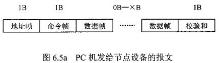 在紙漿流量計等節(jié)點設(shè)備和C機通信的過程中,由地址幀、命令幀、數(shù)據(jù)幀、校驗和可組成各種功能不同的報文。由于采用主從工作方式來實現(xiàn)通信,紙漿流量計等節(jié)點設(shè)備僅能接收并執(zhí)行PC機發(fā)送來的控制命令,而不能發(fā)送命令給PC機。因此,由PC機發(fā)往流量計等節(jié)點設(shè)備的報文一般包括一個地址幀,一個命令幀,若干個數(shù)據(jù)幀和一個校驗和,其報文格式圖.6a5所示;而由流量計等節(jié)點設(shè)備發(fā)往PC機的報文一般包括一個地址幀,若干個數(shù)據(jù)幀和一個校驗和,其報文格式如圖6.5b所示。