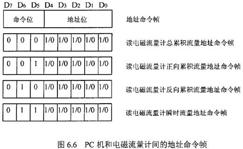 由于RS一485電氣標(biāo)準(zhǔn)規(guī)定每段只能聯(lián)結(jié)犯個節(jié)點設(shè)備,因此可用地址幀中五個二進制位表示這32個地址,其余3位用來表示命令,從而構(gòu)成地址命令幀。對于控制命令需求不超過八個的通信系統(tǒng),采用地址命令幀可壓縮報文長度提高通信效率。在污水網(wǎng)絡(luò)監(jiān)控系統(tǒng)中,紙漿流量計和PC機通信的主要目的是將流量計中的有用數(shù)據(jù)讀到PC機中。這些數(shù)據(jù)包括:總累積流量、正向累積流量、反向累積流量、瞬時流量。通信時,PC機只需向紙漿流量計發(fā)送讀總累積流量、讀正向累積流量、讀反向累積流量、讀瞬時流量命令即可,因此二者間通信所用的地址幀和命令幀可合二為一,用一個地址命令幀代替。PC機和紙漿流量計間的地址命令幀定義如圖.66所示。根據(jù)污水網(wǎng)絡(luò)監(jiān)控系統(tǒng)中PC機與紙漿流量計間通信的特殊性,二者通信所使用的報文可簡化為圖.67的格式。