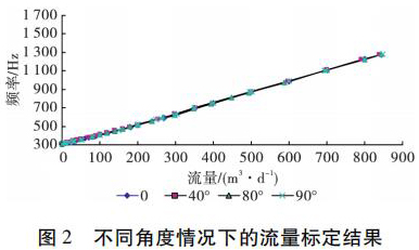 為了考察井眼斜度變化對(duì)進(jìn)水流量計(jì)測(cè)量流量的影響,開展了非集流進(jìn)水流量計(jì)在不同斜度情況下的流量測(cè)量模擬實(shí)驗(yàn)。模擬實(shí)驗(yàn)在大慶油田多相流實(shí)驗(yàn)室進(jìn)行,儀器外徑 38 mm,模擬井筒內(nèi)徑為 124 mm,實(shí)驗(yàn)介質(zhì)是水,傾斜角度分別為 0°、40°、80°和 90°( 水平) ,流量范圍為 5 ~ 850 m3 /d。實(shí)驗(yàn)結(jié)果表明,在儀器居中條件下,井眼斜度變化對(duì)進(jìn)水流量計(jì)的儀表常數(shù)沒(méi)有影響,滿量程誤差不大于 4% ,因此可以應(yīng)用進(jìn)水流量計(jì)進(jìn)行水平井注水剖面測(cè)量。不同角度情況下的實(shí)驗(yàn)結(jié)果如圖 2 所示。