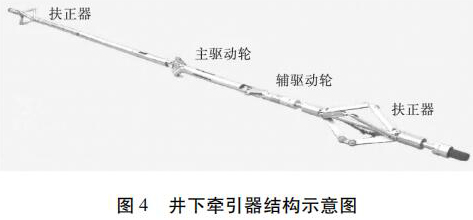 牽引器采用的是 Sondex 公司的牽引器,如圖 4所示。儀器外徑 54 mm,長(zhǎng)度 7.4 m,牽引力 273 kg,耐壓103 MPa,耐溫 150 ℃,牽引速度 540 m/h。牽引器連接于電纜頭和測(cè)井儀器之間。在水平段和造斜段儀器不能靠自重下放,利用牽引器可以將儀器推送到測(cè)井目的層段。井下牽引器由兩組呈 90°交叉分布的驅(qū)動(dòng)臂和扶正器組成。在進(jìn)行井下儀器牽引時(shí),*先打開牽引器驅(qū)動(dòng)臂,使驅(qū)動(dòng)臂端部的驅(qū)動(dòng)輪支撐到套管壁并保持足夠的正壓力,然后驅(qū)動(dòng)輪旋轉(zhuǎn)實(shí)現(xiàn)對(duì)儀器的推送。井下儀器牽引過(guò)程可在地面進(jìn)行人工控制,通過(guò)控制命令和調(diào)整供電電壓可控制井下牽引速度和方向。該牽引器提供了多種井下測(cè)量參數(shù),包括電纜頭電壓和張力、牽引速度、接箍深度等數(shù)據(jù),所有這些沿井身測(cè)量到的參數(shù)均可在地面顯示出來(lái),使施工具有安全性和可操作性。當(dāng)斷開電源時(shí),驅(qū)動(dòng)臂在外力作用下可收回,保證儀器安全取出。