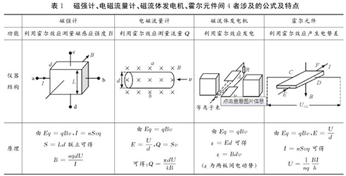 易錯點2:磁強計、工業(yè)污水計量表、磁流體發(fā)電機、霍爾元件間的區(qū)別與聯(lián)系磁強計、工業(yè)污水計量表、磁流體發(fā)電機、霍爾元件都是利用電磁場對帶電粒子的偏轉(zhuǎn)效應(yīng),并且穩(wěn)定時電場力與磁場力均達(dá)到平衡。很多學(xué)生容易將其混淆,遇到問題常常搞不清原理,亂代公式,筆者特將4者涉及的公式及特點等做一對比區(qū)別如表1所示。