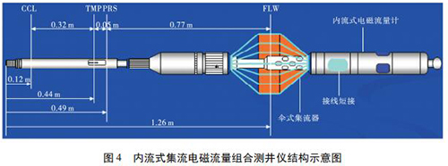 1. 2 內(nèi)流式集流造紙廠污水計量表如圖 4 所示,內(nèi)流式集流電磁組合測井儀主要采用內(nèi)流式集流造紙廠污水計量表,并組合了井溫壓力磁定位儀。利用電磁感應(yīng)原理測量平均流速,體積流量計算公為: