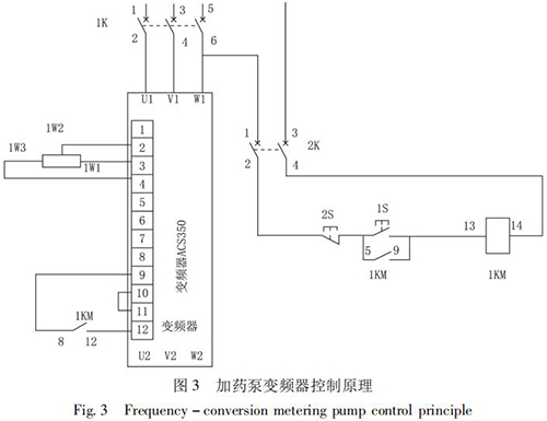 STD - Ⅲ型浮選工藝參數(shù)自動測控系統(tǒng)通過雙膜盒差壓計測量原礦漿濃度; 采用消防管道流量計測量原礦漿流量,由 PLC 計算出入浮干煤泥量和藥劑的瞬時添加量,用變頻式計量泵完成浮選藥劑的添加。通過上位機(jī)還可以打印小時、班、天及月的運行數(shù)據(jù),更加有利于生產(chǎn)管理及技術(shù)分析,藥劑自動原理如圖 2 所示,k1、k2、k3 是計算修正參數(shù)。以 PID 算法為核心,通過優(yōu)化控制程序計算出藥劑給定量,在捕收劑和起泡劑管道上分別安裝藥劑測量裝置,用于檢測藥劑的添加量。當(dāng)藥劑測量值小于藥劑給定量時,PID 輸出增大,反之則減小。加藥泵變頻器控制原理如圖 3 所示。
