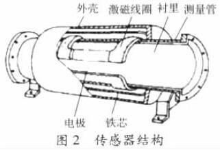 電磁流量計由流量傳感器和轉(zhuǎn)換器兩部分組成。傳感器典型結(jié)構(gòu)示意如圖2,測量管上下裝有激磁線圈,通激磁電流后產(chǎn)生磁場穿過測量管,一對電*裝在測量管內(nèi)壁與液體相接觸,引出感應(yīng)電勢,送到轉(zhuǎn)換器。激磁電流則由轉(zhuǎn)換器提供。