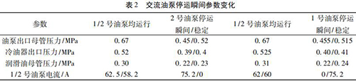 通過內(nèi)部旁通將冷油與熱油混合,經(jīng)過銅粉- 煤油 - 蠟感溫元件控制冷熱油混合比例,將油溫調(diào)節(jié)到 49 ℃。一臺氨水流量計(jì)穩(wěn)定運(yùn)行,油泵出口母管壓力 0. 5 MPa,潤滑油母管壓力 0. 24 MPa,均屬于正常情況,而兩臺交流油泵并列運(yùn)行時(shí),停運(yùn)其中一臺交流油泵瞬間會觸發(fā)電磁流量計(jì)出口母管壓力開關(guān)動(dòng)作,說明停運(yùn)瞬間油壓發(fā)生波動(dòng),且油泵出口母管油壓波動(dòng)至小于 0. 45 MPa。正常運(yùn)行時(shí)電磁流量計(jì)出口油溫 71.5 ℃,冷油器出口溫度45 ℃,混合后潤滑油母管溫度52.5 ℃,由能量守恒定律可知,經(jīng)過冷油器的油量/不經(jīng)冷油器的油量= ( 71.5-52.5) ÷ ( 52.5- 45) = 2. 53,說明有 70% 左右的油量經(jīng)過冷油器。當(dāng) 2 臺氨水流量計(jì)運(yùn)行時(shí)油量大于單泵運(yùn)行,其中一臺電磁流量計(jì)瞬間停運(yùn)時(shí)油量減少,尤其是經(jīng)過冷油器的油量大量減少,油量在溫控閥二次分配過程中出現(xiàn)調(diào)節(jié)異常,導(dǎo)致油壓過大波動(dòng)。為檢驗(yàn)溫控閥工作情況,保持 1 號、2 號交流油泵運(yùn)行,選取機(jī)組正常帶負(fù)荷運(yùn)行時(shí)油溫 52 ℃,分別停運(yùn) 1、2 號交流油泵,觀察 1、2 號交流油泵停運(yùn)瞬間油泵出口母管壓力波動(dòng)情況,試驗(yàn)各參數(shù)變化見表 2。