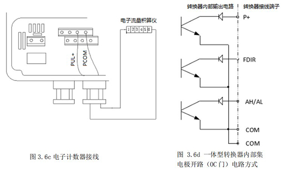 1.5 頻率(脈沖)、上下限報警、流向標(biāo)示等輸出均為集電*開路的電平輸出信號。