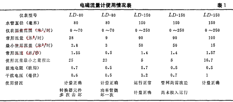 我廠自1981年3一8月,分別對(duì)四個(gè)車間的用水點(diǎn)安裝了五臺(tái)儀表,每臺(tái)配用一支DX S-102積算器,測定的是生產(chǎn)用水,溫度為常溫,電導(dǎo)率為1.2x10-3姆歐,安裝方式為水平有旁路伐(見表1)。