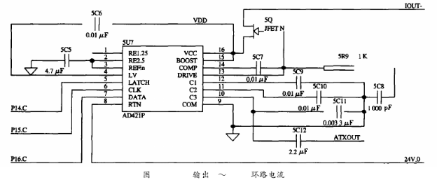 HT2012需要外部提供460.8kHz的時(shí)鐘信號(hào),且要求時(shí)鐘頻率的誤差是0.1%,若直接入一個(gè)460.8kHz的晶振不僅會(huì)引起系統(tǒng)功耗的增加,而且該晶振屬于非標(biāo)準(zhǔn)晶振,需專門(mén)定制。為了解決這一問(wèn)題,在系統(tǒng)中采用一片1.8432MHz的晶振以產(chǎn)生時(shí)鐘信號(hào),再經(jīng)分頻器CD4013進(jìn)行4分頗,可輸出1.8432MHz/4=460.8kHz的分頻信號(hào)供HT2012使用。AD421其內(nèi)部的電壓調(diào)節(jié)器與外部的場(chǎng)效應(yīng)管DN25D對(duì)輸入到AD421的電壓進(jìn)行調(diào)整,可提供+3.3V電壓作為其他設(shè)備的電源。HART發(fā)出的FSK信號(hào),經(jīng)過(guò)一個(gè)電容耦合送到AD421中,轉(zhuǎn)換成相應(yīng)的0.5mA正弦電流信號(hào),實(shí)現(xiàn)電壓信號(hào)到電流信號(hào)的轉(zhuǎn)換,同時(shí),疊加在4~20mA的電流上送給接收設(shè)備,實(shí)現(xiàn)了HART協(xié)議的信息的交換。本電路耦合電容取為0.0033μF,如圖5所示。