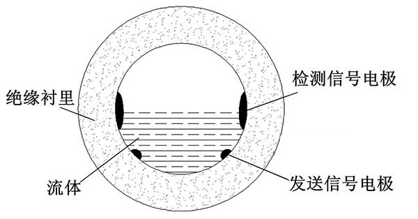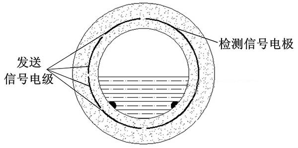 ③利用阻抗或信號(hào)衰減研制的非滿管水處理流量計(jì)。這種結(jié)構(gòu)的非滿管水處理流量計(jì)是當(dāng)前國內(nèi)研究的方向之一。其結(jié)構(gòu)是流量管底部貼一對(duì)信號(hào)發(fā)射電*,在流量管中間貼信號(hào)接收電*。由于信號(hào)在流體中傳播會(huì)產(chǎn)生衰減,且傳播時(shí)間越長(zhǎng),衰減越多,因此通過信號(hào)接收電*接收到的信號(hào)衰減量即可得知液面高度;同時(shí)該電*還能測(cè)量流體切割磁感線產(chǎn)生的電動(dòng)勢(shì),以此達(dá)到測(cè)量非滿管流量的目的。阻抗式或信號(hào)衰減非滿管水處理流量計(jì)結(jié)構(gòu)簡(jiǎn)圖如圖5所示。