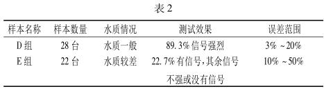 當(dāng)然除了管徑這一大因素外,污水水質(zhì)的好壞也是一個(gè)影響檢測效果的原因。把受檢的 50 臺(tái)流量計(jì)所流過的水質(zhì)分為兩組,水質(zhì)一般 D 組和水質(zhì)較差 E 組。整理數(shù)據(jù)見表 2。