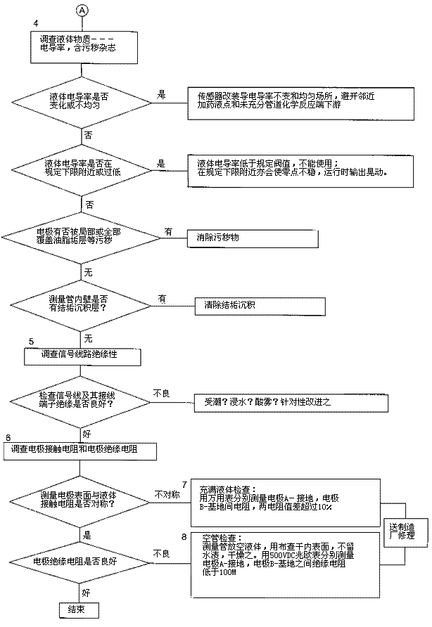 檢查流程圖*3項。管道雜散電流等外界干擾影響主要靠液體流量計良好的接地保護,通常要求接地電阻小于1000,不要和具他電機電器共用接地。有時候環(huán)境條件較好,液體流量計不接地亦能正常工作,但是一旦良好環(huán)境不存在,儀表會出現(xiàn)故障,屆時再作檢查會帶來堵多麻煩。