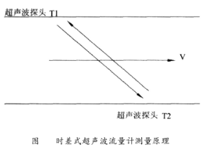 時差式超聲波流量計用于測量流體流速對雙向聲波信號的影響。它的兩個換能器探頭(T1、T2)以一定的間距安裝在管壁外側(cè),交替發(fā)射和接收超聲波。當超聲波在靜止的流體中傳播時,從T1到T2的聲波信號傳送時間與從T2到T1的傳送時間相同;當流體流動時,上游換能器T1向下游換能器T2發(fā)射一個信號,同時下游也向上游發(fā)射信號,由于流體流速對超聲波信號的作用,加快從上游到下游方向的信號傳播速度,同時減慢從下游到上游方向的信號傳播速度,兩個信號之間產(chǎn)生了時間差。由此求得流體的流速,再與圓管的流通截面積相乘計算出流量。流體流速的基本計算公式: