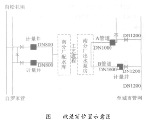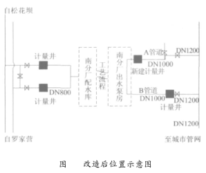 根據(jù)上述分析及現(xiàn)場勘測發(fā)現(xiàn):昆明市*五自來水廠出水A管道時差式超聲波流量計安裝位置下游長度不滿足要求,在探頭安裝位置下游附近管道管徑由1.0m變?yōu)?.2m,并且接有一根DN200的支管。因此在供水高峰期時,此段由于三通、閥門影響,水流易產(chǎn)生紊流、渦流從而產(chǎn)生氣泡,大大減小聲波信號的強度,致使時差式超聲波流量計出現(xiàn)信號中斷。通過在探頭位置靠近出水泵房一側(cè)移動7m挖計量井,其位置滿足上下游直管段長度要求,利用便攜式超聲波流量計在此位置進行水流計量檢驗,其結(jié)果信號良好。由此說明先前探頭安裝直管段長度不滿足要求造成信號中斷。時差式超聲波流量計位置見圖4。