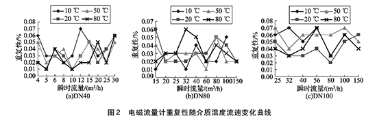 將實(shí)驗(yàn)測(cè)得的pvc排水管流量計(jì)在不同溫度及流速下的重復(fù)性數(shù)據(jù)整理,特性曲線如圖2所示,3組曲線分別對(duì)應(yīng)DN40, DN80, DN100的3塊pvc排水管流量計(jì)的重復(fù)性曲線。
